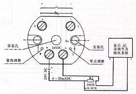 端子1、2接热电阻,或2接热电偶正,1接热电偶负。变送器有零点及量程调节电位器,便于用户进行微量调整。