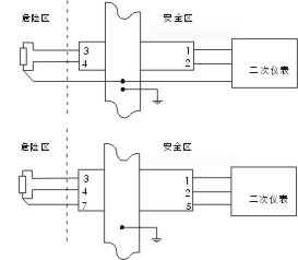 热电阻测量温度时,选用HD-WP6131-21-QEX型安全栅(双通路)或HD-WP6131-23-QEX型安全栅(三通路),可