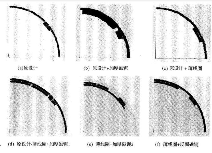 以上进行了包括原设计在内的6种磁路计算可以看出:第2种和第6种设计具有管道中心处较大的磁感强度。这主要是由于加大磁轭分量引起的。第4种和第5种设计只在原有磁轭上进行局部加厚改进,效果不太明显。第3种设计是薄线图设计,磁轭没有变化,最后的磁场分布与原设计相比也没有明显的变化。但是由于线图的厚度变薄,增加了电磁流量计传热面积,这种改进是很重要的。另外,第3种设计改变很少,在实际工艺实话方面是最方便的。所以,选择第3种方案