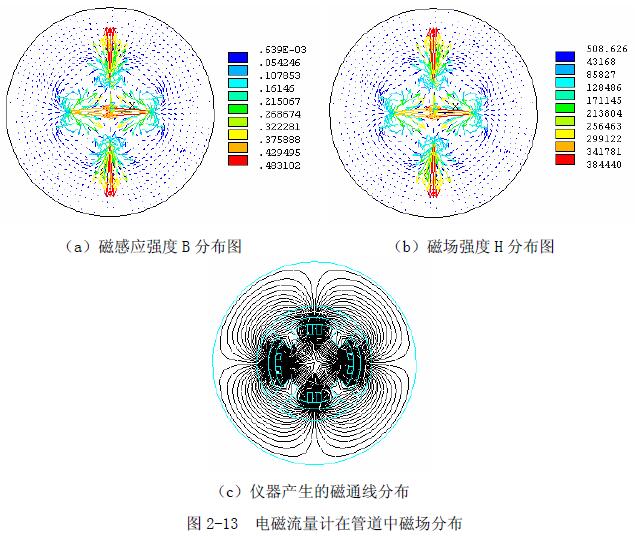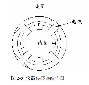 电磁流量计传感器结构图如图 2-9 所示,除了线圈和电极,中间部分为填料,电极之间为绝缘衬里,其目的是防止感应信号电压被金属管短路。