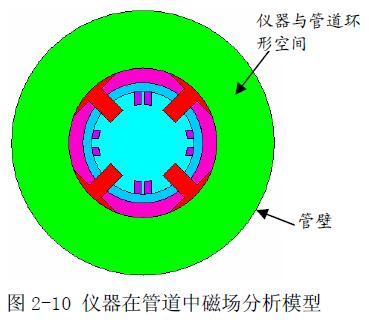 将电磁流量计置于管道中心位置(通过上下扶正器),建立实体模型。模型中有六种不同的材料,在分析时,需要给每种材料施加一个属性―磁导率,否则不能进行求解。将六种不同属性的材料用不同颜色显示,如图2-10 所示,仪器与管壁之间绿色部分即为流体通过的环形空间。