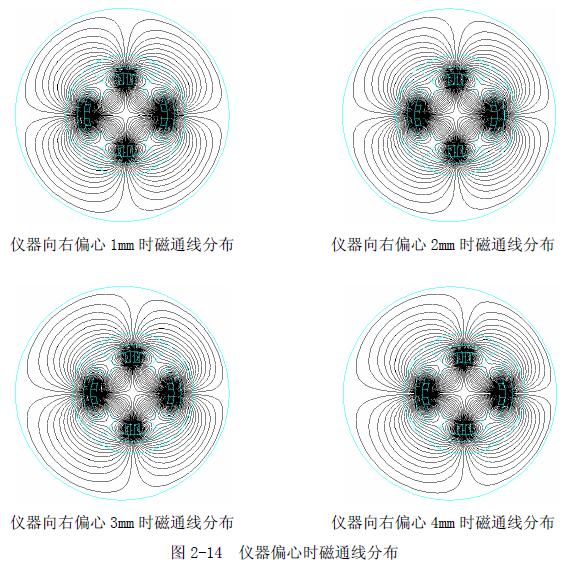 在电磁流量计使用过程中,由于各种环境因素的影响,有时仪器并不一定处于管道中心位置,而会偏离中心一定的距离。此时线圈激励产生的磁场在管道内的分布情况也将发生变化,图2-14 为仪器在管道中向右偏心1mm、2mm、3mm、4mm时磁通线的分布。