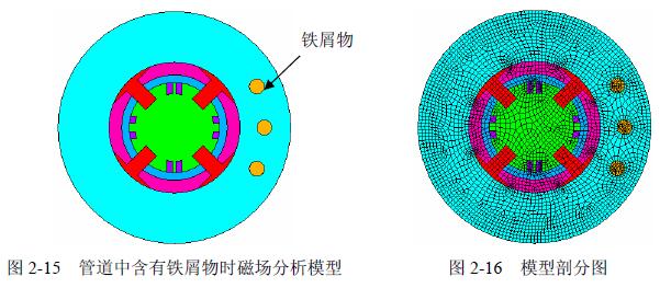 在环形空间放置铁屑物,建立磁场分析模型,如图2-15 所示,图中三个橙色小球即为铁屑物。图2-16 为该模型的剖分图。