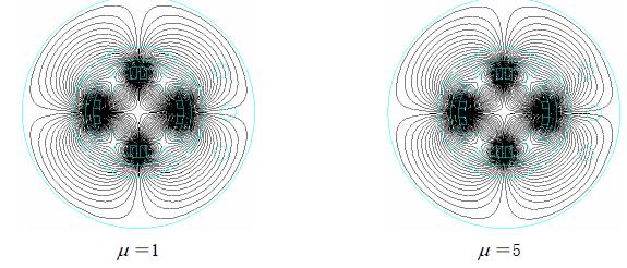 为了较大范围的考察铁屑物对测量的影响,选取铁屑物的半径r=0.5mm,1mm, 1.5mm, 2mm, 2.5mm, 3mm, 磁导率μ 从1~15 变化,计算各种情况下的磁场分布。本文只给出r=2mm 时各种磁导率情况下的变化规律,如图2-17 所示。其他尺寸情况类似。