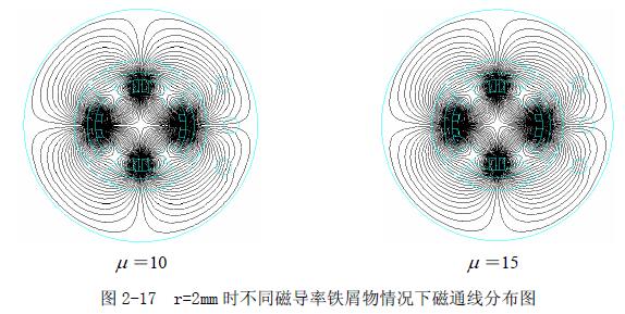 从图 2-17,午夜免费福利可以看到,随着铁屑物磁导率的增大,铁屑物的导磁作用增大,使得其附近的磁场也发生了变化。但是,这种变化是微小的,这从磁导率由1 变化到15 而磁通线分布差异不大可以看得出来。只有在最靠近铁屑物的地方磁通线才有一点变形,其他位置磁通线分布几乎没有受到影响。所以,当管中存在铁屑物时,对仪器的测量结果影响不大。