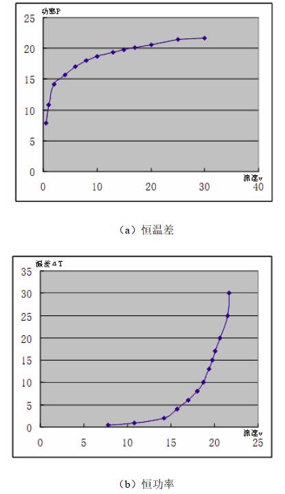 根据气体流量测量原理,可以得出恒温差和恒功率热式气体质量流量计输出信号和流速之间的关系,横坐标代表流速,纵坐标代表输出信号(温差△T和功率P),则这两种测量方法的输出信号与流速变化曲线如图2.4所示: