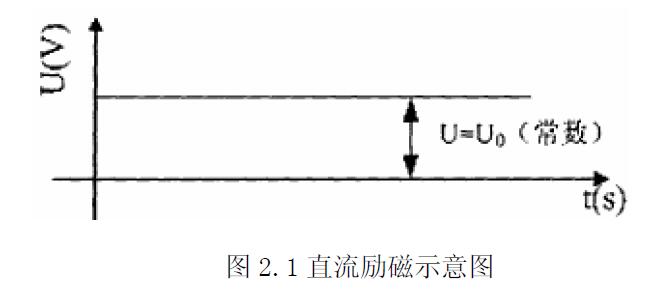 直流励磁技术是利用永磁体或者直流电源给电磁流量传感器励磁绕组供电,以形成恒定的励磁磁场,这种流量计感应的流量信号是直流电压信号,如图2.1所示。具有方法简单可靠、受工频干扰影响小以及流体中的自感现象可以忽略不计等特点。但是,直流励磁技术的最大问题是直流感应电动势在两电极表面上形成固定的正负极性,引起被测流体介质电解,导致电极表面极化现象,使感生的流量信号电势减弱,电极间等效电阻增大,同时出现电极极化电势漂移,严重影响信号处理部分的工作。即使电极采用极化电势很小的铂、金等贵金属及其合金材料,常常也存在微弱的极化电势,同时仪表的制造成本较高。另外,直流励磁在电极间产生不均衡的电化学干扰电势,叠加在直流流量信号中无法消除,并随着时间的变化、流体介质特性以及流体流动状态而变化。第三,直流放大器的零点漂移、噪声和稳定性问题难以获得很好的解决。特别是在小流量测量时,信号放大器的直流稳定度必须在几分之一微伏之内,这样就限制了直流励磁技术的应用范围。目前直流励磁技术仅在原子能工业中用于导电率极高,而又不产生极化效应的液态金属流量测量中。