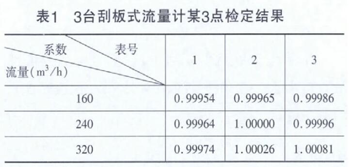 对于准确度等级优于0.5级的流量计,检定时其检定点不少于5个点,根据流量范围均匀分布,每个检定点至少检定3次。由于有5个流量检定点,因此就有相应的5个检定误差和5个流量系数。这些点检定误差和流量系数不可能完全一致,有的点可能为零误差,有的点在零误差左右,因此流量计系数有大于1、小于1或等于1的可能。例如,某刮板流量计检定结果如表1所示。