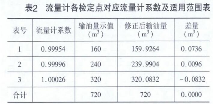 根据GB/T9109.5-2009《石油和液体石油产品油量计算动态计量》之8.1.2流量计系数法计量油品体积量计算方法,确定流量计各检定点对应流量计系数及适用范围表,如表2所示。