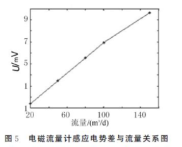 仿真实验中,电磁流量计中流体平均流速分别设定为0.6687m/s,1.6717m/s,2.6747m/s,3.3433m/s,分别进行仿真与数值计算电磁流量计感应电势差.如图5所示为流量与电磁流量计感应电势差关系图,从仿真结果可以看出流量越大,感应电势差也就越大,总体上说,流量与感应信号基本上成线性关系,仿真结果符合电磁流量计的相关理论.