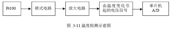 本设计是以Pt100 铂电阻为温度传感器,但是温度的变化只会改变传感器的阻值大小,而阻值的变化不能直接的检测到,因此把温度传感器接入一个桥式电路当中。通过阻值的变化,从而改变电压。这种电压的变化单片机可以直接的检测到。温度检测过程示意如图3-11 所示。