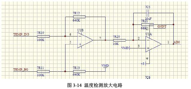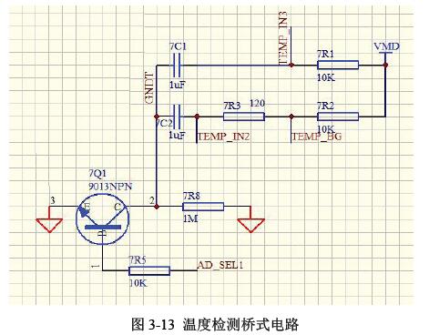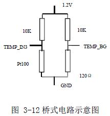 桥式电路示意图如图3-12 所示。具体电路图如图3-13、3-14 所示。其中VMD 为1.2V。因为温度的变化不是那么快,所以采集温度的频率也用那么高,通过一个三极管的通断来控制温度的采集频率。通过单片机的I/O(AD_SEL1)口来控制三级管的导通与关断,三级管导通的时候采集,否则不采集,这也满足了本设计低功耗的设计需求。