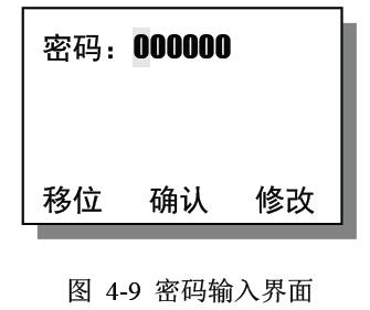设定初始密码为100000(密码修改在二级菜单有介绍);通过“移位(F1)”以及“修改(F3)”键将密码设置正确后,最后按“确认(F2)”键.若密码正确,则进入系统菜单进行参数修改;不正确,则显示“密码错误!”,然后退回到进入密码页面前的主界面.本设计有三级菜单项,每一级菜单对应一个密码,输入相对应的密码即可进入菜单项,如图4-9.