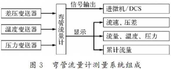 弯管流量计实际是以智能积算仪为核心的多参数测量仪表系统,输入量有3个:由弯管产生的压差、流体的温度和压力。这3个信号全部输入弯管流量计的主计算机进行处理,最后由显示仪显示测量流量。弯管流量计测量系统如图所示。