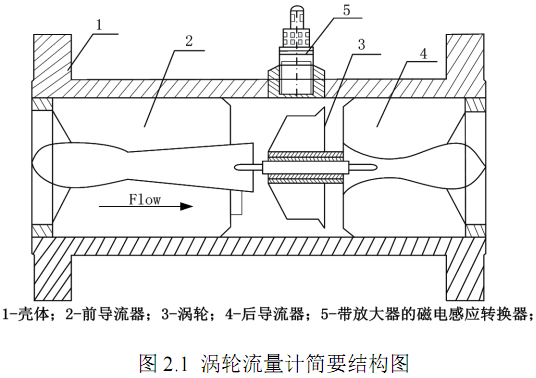 从20世纪60年代中期,涡轮流量计开始在我国应用,经过多年改进,已成为当前较为成熟的高精度仪表。它由传感器和流量积算仪组成,利用涡轮转速与流体流速的对应关系,通过测量转速来得到体积流量。图2.1为涡轮流量计的简要结构,它由1仪表壳体、2前导流器、3涡轮、4后导流器和5带有放大器的磁电感应转换器等组成。