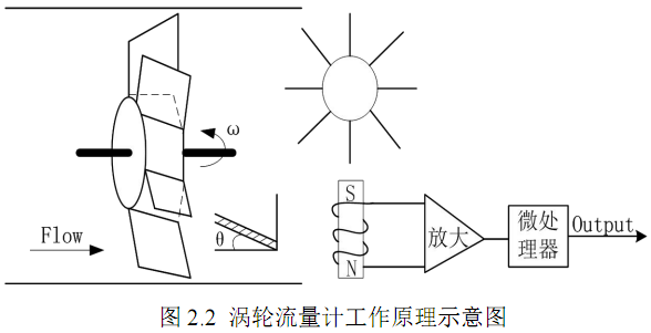 在被测流体通过流量计时,经过导流器后,涡轮叶片受到冲击,由于叶片与流速间存一夹角,使得产生转动力矩,为克服相应力矩而涡轮转动。此时涡轮的旋转角速度与流过的流量成一定的比例关系,为测得流量即可通过测量涡轮的旋转角速度。图2.2为涡轮流量计的工作原理示意图。