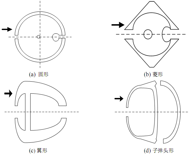 (1) 圆形。最初的均速管流量计截面形状如图(a)。流体绕过圆形截面时,流体在圆周上的分离点会随雷诺数的增大而后移,此时造成流量系数不稳定。