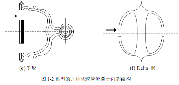 (5) T形。2001年由美国DSI公司研制出。如图(e)所示。在检测杆的迎流侧和背流侧开两排全压孔,T形漩涡区取静压,增大输出差压。但差压较大时,由于开孔直径较小,易堵塞取压孔,造成测量失效。