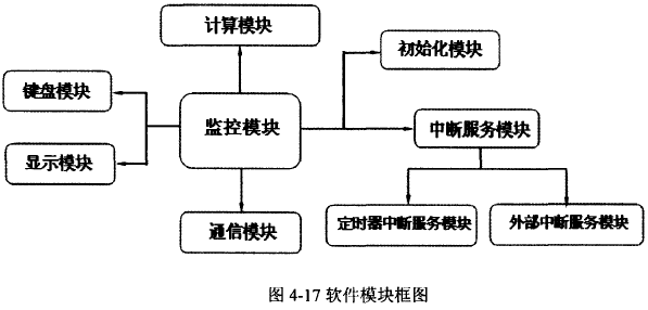 系统软件设计采用模块化设计方法。主要包括:监控模块,计算模块,初始化模块,键盘与显示模块,通讯模块,中断服务模块。各个模块都有各自的功能,又相互联系,软件部分的工作量非常大,本章结将按模块逐一介绍。