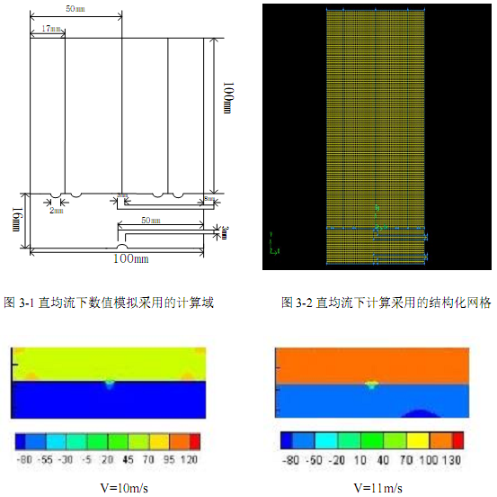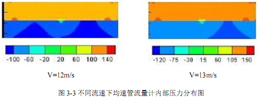 计算方法采用SIMPLE算法,数值模拟出不同进口速度直均流流场的阿牛巴流量计内部压力分布,如图3-3所示。由图3-3可知,流体流过矩形进气槽后,流经阿牛巴流量计时,在检测杆前端即全压孔开孔位置附近形成高压分布区。检测杆背流侧形成低压分布区。当改变矩形进气槽进口速度时,高低压区的压力值发生变化,但是压力分布的几何区域基本没有大的改变。仿真时发现当进口速度超过10m/s时,阿牛巴流量计的流量系数趋于稳定,故本仿真实验矩形进气槽的进口速度下限为10m/s。