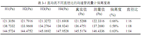 从表3-1中可以看出,不同直径比的阿牛巴流量计测量结果的偏离度虽有波动,但变化很小,都在0.66%范围内。即直均流流场中,均速管尺寸对其测量精度无明显影响,阿牛巴流量计直均流的测量精度高。
