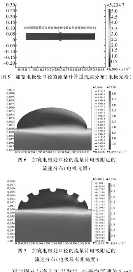 对比图6与图7可以看出,在平均流速为5m/s的条件下,加宽电极处管道口径后,测量电极附近的流场基本不受电极表面粗糙度的影响,这样可以避免电极的表面粗糙度对电磁流量计传感器测量所造成的误差,从而证明了该方案的可行性 |