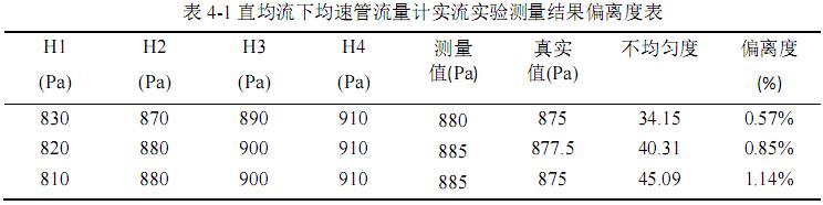 在此流速分布条件下,测量各全压孔压力H1=830Pa、H2=870Pa、H3=890Pa、H4=910Pa。全压孔全开时测量全压引压管引出压力为870Pa。所有全压孔的压力值作算术平均后代表A溪流测量处水流的真实平均全压,与全压孔全开时阿牛巴流量计测量的平均全压作偏离度,得到结果为0.57%,测量结果精度较高。可认为所加工的阿牛巴流量计结构正确。溪流A处进行三次实验,得到的数据经处理后由下表4-1所示。 在实流实验中,流速分布不能与模拟实验一样准确控制,流速分布只能由实际情况确定。为使每次实验流体的流速分布均有微小差异,故进行下一次实验前,在阿牛巴流量计上游放入障碍物使流速分布有微小改变。此变化为非线性,由表中数据也可看出,各全压孔压力的变化无明显规律。 为确定流速分布不均是否是造成阿牛巴流量计测量平均全压与真实值偏离的原因,在表中第七列特作出四孔压力的标准差,作为真实流场流速分布的不均匀度。得到直均流下阿牛巴流量计实流实验测量结果偏离度表4-1。