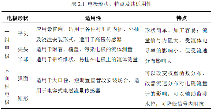 电磁流量计电极在测量过程中与被测量导电流体介质进行直接接触,因而容易受到流体介质电化学反应而产生的干扰信号的影响。电极能否有效、可靠地检测流量信号,对流量传感器而言非常重要。电极的形状、尺寸和被检测的流量信号有关,应根据不同的需要进行选择。如表2-1所示就是电极形状、特点及其适用性。