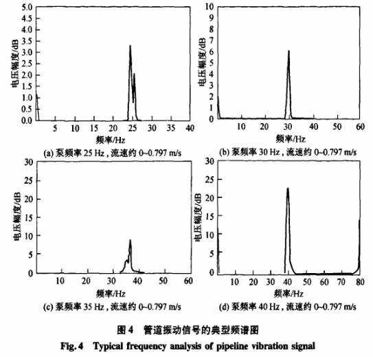 本研究对不同流速和泵频率组合下的涡街流量信号进行了数据采集和频谱分析,其中水泵采用格兰富AP12.40单级潜水泵,分别调节流速约0.209,0.403,0.611,0.797m/s.控制水流速的大小,在每一开度下,再分别设置水泵工作频率为25,30,35,40Hz,以输人不同的振动干扰信号,如图2所示.可见当流速小时噪声能量接近甚至大于实际信号能量,在线的频谱分析很难判断..