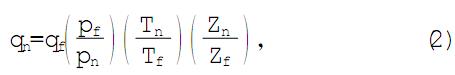 式(2)中,qn为标准参比条件下的体积流量,m3/s;pf为工作条件下的绝对静压力,MPa;pn为标准参比条件下的绝对静压力,MPa;Tn为标准参比条件下的热力学温度,K;Tf为工作条件下的气体绝对温度,K;Zn为标准参比条件下的气体压缩因子;Zf为工作条件下的气体压缩因子。