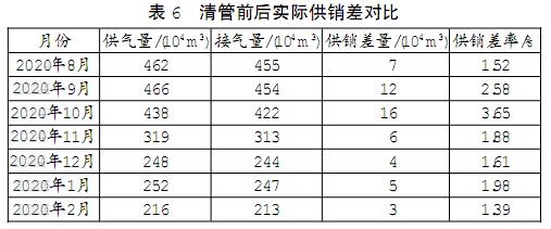 2020年8—10月期间,下游公司发现正供销差持续增大时,对A分输站和B分输站的涡轮流量计进行了标定,但标定结果均为合格。随后下游公司在2020年11月5—7日对A至B分输站段管线进行了清管作业,共清出污水杂质约23t,清管完成后正供销差明显减小。清管前后实际供销差数据如表6所示。