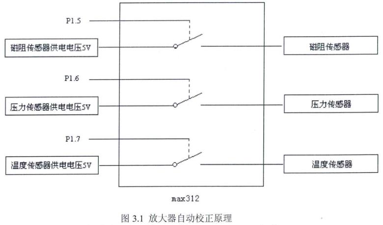 对放大器进行校零时,将流量、压力以及温度采集模块断电,使得各采集单元没有信号输出,即令放大器的输入信号为零。然后,对放大器的输出信号进行A/D转换,得到一个数字量Do,此数字量即为放大器的漂移,将此值保存起来。当系统处于正常工作模式,采集测量信号时,将采集到的信号减去Do,即可消除放大器零点漂移带来的误差。设计中,对各采集模块进行断电操作是通过单片机控制max312来实现的。电路如图所示: