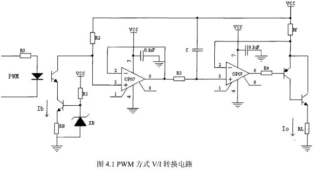 设计中,单片机根据瞬时流量的大小,输出周期固定,占空比变化的PWM。PWM为高电平期间,光电稱合器导通工作,此时,Ri、Rb、三极管以及稳压管ZB产生的恒定不变的电流lb将流过R2,并在R2上产生一个电压V1,此电压对电容C充电,最终转换为电容C上的电压,电阻Rf两端电压等于电容C两端电压,流经Rf的电流约等于输出电流I0。此电流大小为: