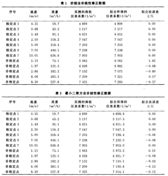 最小二乘方法得到的是一条连续曲线,其原则是使各检定点到该曲线的误差平方和为最小。由于检定点上得到的数据并非标准值,其本身也具有一定的误差,而且实际使用的涡轮流量计K-F特性曲线应该是连续的、平滑的,因此尽管在检定点处的拟合误差不一定等于零,但用最小二乘方法得到的连续曲线应该能更好地反映K-F关系的本质9]。表2给出了用最小二乘方法得出的一组非线性修正拟合误差数据。