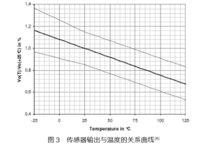 图3是传感器输出信号与温度的关系曲线,可见在一定范围内,传感器输出信号幅值与温度成反比关系,可以得到: