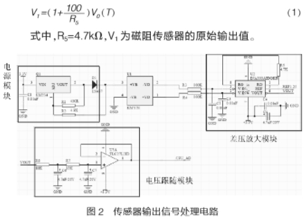 信号采集包括温度传感器输出信号获取和磁阻传感器信号获取,温度传感器的输出信号通过SPI方式传送给微处理器,用于对磁阻传感器的输出做温度补偿,磁阻传感器的输出信号将用于流量计算,经过信号放大处理后直接传送至微处理器。图2为磁阻传感器输出信号处理的硬件电路图。包括电源模块差分放大模块和电压跟随模块。电源模块采用恒流源给KMY20磁阻传感器供电,在--定程度上减小了温漂对传感器输出的影响"。差分模块完成对传感器输出信号的放大处理,电压跟随模块减小了传感器的输出阻抗。从图2可知,经放大处理后,传感器的输出信号幅值为: