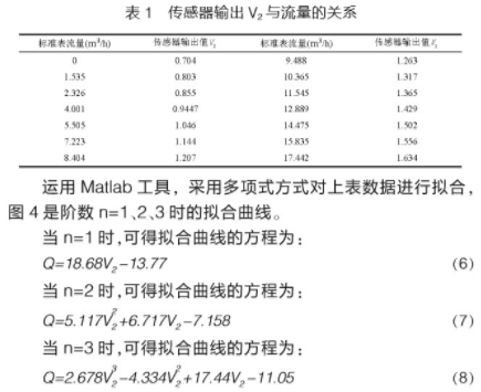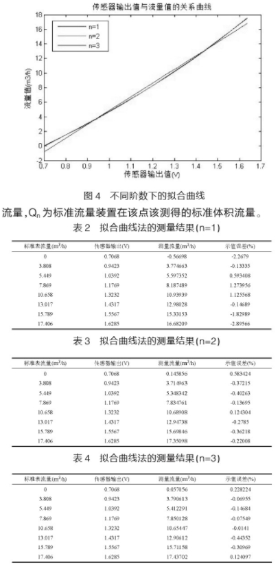从表2~表4可知,以阶数n=1得到的拟合曲线计算流体流量,示值误差最大在2%以.上,拟合效果不理想,而以阶数n=3得到的拟合曲线计算流体流量时,示值误差在1%以内,满足测量要求,但由于拟合方程相对复杂,加大了算法的复杂度,使流量计算占用CPU时间变长,降低了系统测量的实时性。所以本设计选择n=2时拟合得到的方程来计算流量,不仅满足了系统的实时性要求,而且系统的测量精度也在1%以内。