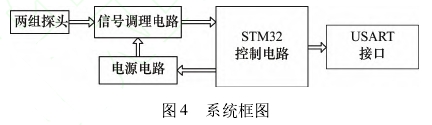 热式气体质量流量计系统框图如图4所示。电路主要分为3部分:信号调理电路、电源电路和控制电路。信号调理电路由桥式电路和差分放大电路组成;电源电路由LM317和数字电位器X9111组成;控制电路主要以STM32F103C86T为核心。双探头的阻值随着温度和流量的变化而变化。因此信号调理电路的平衡被打破,其信号由控制电路采集进行判断。STM32根据当前速度探头支路电流进行判断。如果小于0.09A,采用恒温差法,调节电源输入,使得电桥保持平衡,采集电流值,依据电流与流量之间的关系求得流量;如果大于0.09A,采用恒功率法,调节电源输入,使得速度探头功耗恒定,测得双探头温度差,依据温度差与流量之间的关系求得流量。最后所测结果通过USART接口传输至上位机。
