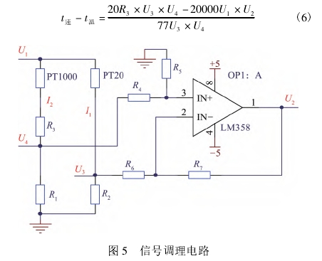 信号调理电路如图5所示,信号调理电路相邻两端为PT20和PT1000,另外两端电阻为20Ω的电阻R2和1kΩ的电阻R1,在PT1000电阻一端有补偿电阻R3,R1和R2两端的电势差经差分放大后为U2。差分放大电路中R4=R6,R5=R7。可调直流电源提供电压U1。无任何气体流过时,速度探头的温度比温度探头高100℃,补偿电阻R3保证电桥平衡,此时电势差U2为0,电势差U2由AD7066芯片进行采集。R1、R2两端电压U3、U4由AD7066采集后,除去阻值即可得到速度探头和温度探头支路电流I1和I2。若I1值小于0.09A,采用恒温差法,根据I1值求得流量。当进气流量增大时,速度探头发生热对流,被气体带走一部分热量,温度降低,阻值减小,电桥平衡被打破。控制电路根据电势差U2增大U1输入,I1增大使得速度探头功耗增大,温度上升,阻值上升,电桥重新平衡;而当进气流量减小,速度探头温度升高,阻值增加,则减小U1输入,减小I1,减小速度探头功耗,速度探头温度降低,阻值减小,电桥重新平衡。若I1值大于0.09A,采用恒功率法进行测量,根据温度差求得流量。进气流量增大,速度探头温度降低,阻值减小,功耗增大,减小U1输入,使得速度探头功耗维持定值;进气流量减小,速度探头温度升高,阻值增大,功耗减小,增大U1输入,使得速度探头功耗维持定值。温度差公式如式(6)所示。