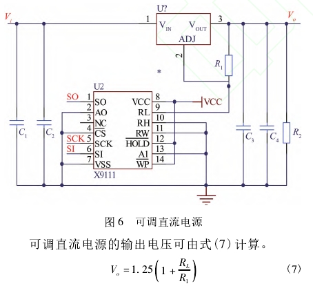 电源电路如图6所示,以LM317为核心。LM317是应用最为广泛的电源集成电路之一,它不仅具有固定式三端稳压电路的最简单形式,又具备输出电压可调的特点。此外,还具有调压范围宽、稳压性能好、噪声低、纹波抑制比高等优点。选用数字电位器X9111作为可调电阻RL。X9111总共拥有1024个轴头,采用SPI接口通信,具有使用灵活、调节精度高等优点。X9111最大阻值为100kΩ,同时其功耗相比于其他电位器而言很低。