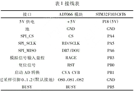 热式气体质量流量计控制电路以STM32F103C8T6为核心组成最小系统,引出足够的I/O口以作拓展。因为信号调理电路输出的电势差U2具有正负极性,所以STM32F103C8T6自带AD采集无法满足要求,选用AD7066芯片进行采集。AD7066自带数字滤波器,有8个采集通道,支持真正±10V或±5V的双极性信号输入电流。AD7066有并口接线和SPI串口接线两种接线方式,此处采用SPI串口接线。STM32最小系统与AD7066之间的接线如表1所示。AD7066的V1~V4口分别采集U1~U4的电压值。STM32通过对电位器X9111的RL控制改变电源输出电压大小。STM32的PB13口接X9111的SCK口,PB14口接X9111的SO口,PB15口接SI口。