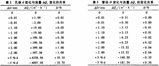 成人午夜免费视频在加工制造过程中总是存在一些偏差,或使用过程中孔板的磨损”。其中与流量测量精确度密切相关的有节流件开孔直径d和靠近节流装置的直管段内径D。当d和D实际尺寸偏离设计尺寸后,造成的后果就是流量测量系统的满度值产生了变化,见表2和表3。如果将d和D的实际值测量出来,然后代人公式计算出与此实际值相对应的流量满度值,然后用新的满度值代替原设计值,置人流量显示仪表,则系统运行后尺寸误差对测量系统的影响就得到了完全的校正。.