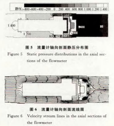 观察图5和图6,当流体流经叶轮从后导流器流出涡轮流量计时,压力梯度变化明显,存在负压区域并造成很大的压降,在后导流器凸台及流量计出口处速度变化明显,由于气流通过后导流器后流道突扩,在后导流器背面形成明显的低速涡区,产生漩涡二次流。