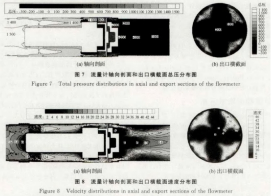结合图7、图8流量计轴向剖面和出口横截面的总压及速度分布图,其速度分布与压力分布相似,流量计流道内速度分布较均匀的区域其压力梯度变化也较小,即流道内速度的分布和变化与压力损失大小相关.由流量计轴向剖面和出口横截面的速度及压力分布图可以看出,流量计后导流器处产生的漩涡二次流影响了出口横截面处的速度及压力分布,流体呈螺旋状流动,故出口处速度及压力较大区域均偏移向流体旋转方向。