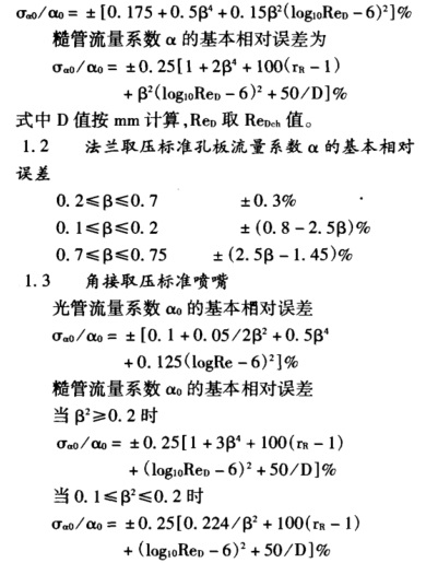 1.1.角接取压标准孔板在节流件上游侧的管道没有管径突变,节流件的安装经检验其偏心率≤1/10x0.015D(1/β-1),环室(或夹紧环)的开孔直径与管道内径相等,在此条件下,角接取压孔板.的光管流量系数α0的基本相对误差为: