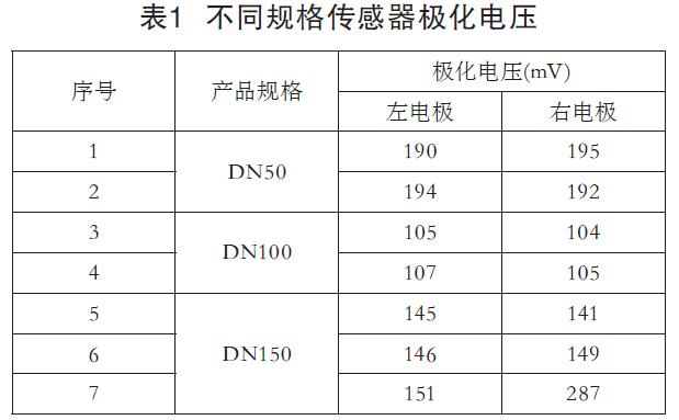 如表1所示,传感器满管无流量状态下,不同口径传感器的极化电压测试情况。1~6号传感器两个电极极化电压相近,转换器工作正常。7号DN150传感器,两个电极材质有明显差异,极化电压测试结果相差2倍左右,从而导致转换器AD芯片出现饱和,无流速输出。