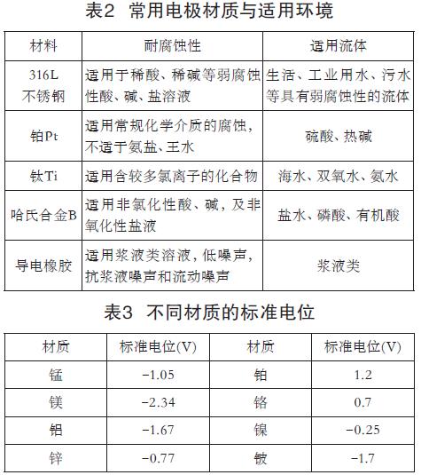 流量传感器电极在材质上分为多种材料类型,并具备不同的耐腐蚀性、电极电位等特点。实际应用中;电极材料的选择首先考虑被测流体的腐蚀性(见表2),避免产生电极表面效应,其次是选择电极电位低的材质(见表3)。