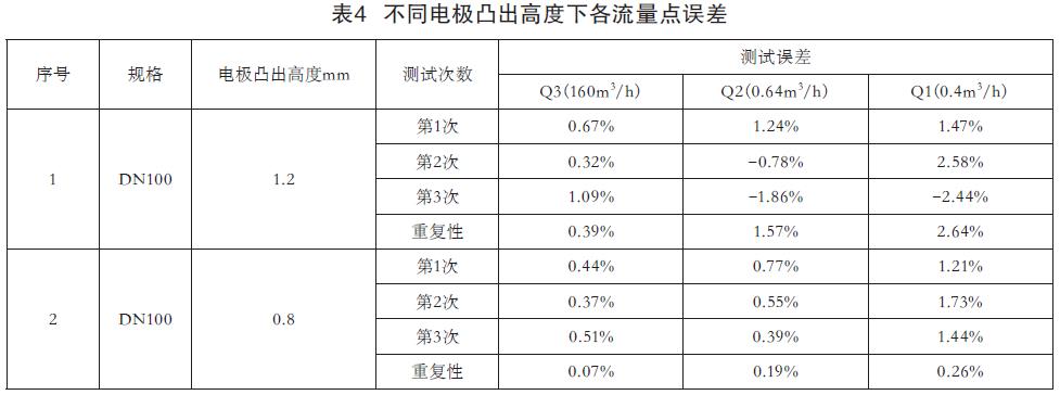 如表4所示,选2只相同规格表:相同电极材质、类型以及转换器。唯一不同为电极安装高度,1号表电极凸出内衬表面1.2mm,2号表电极凸出内衬表面0.8mm,相同测试条件下Q3、Q2、Q1各测试3次。从实测数据看,1号表在Q3大流量下各误差有轻微波动,但整体变化不大。但在Q2、Q1小流量下,各误差出现剧烈波动,重复性不合格;2号表各误差和重复比较很稳定。实际论证了电极凸出高度过高将会对小流量性能产生比较大影响。