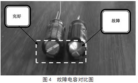检测过程中发现,此电容损坏的主要现象为电容鼓包。故障电容对比图,如图4所示。