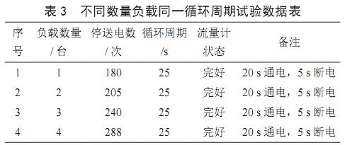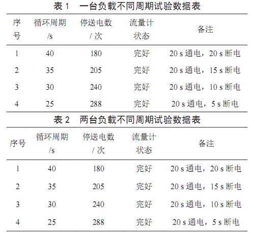 一台负载不同循环周期停送电的实试验情况,如表1所示。两台负载不同循环周期停送电试验情况,如表2所示。25s循环周期不同数量负载停送电试验情况,如表3所示。